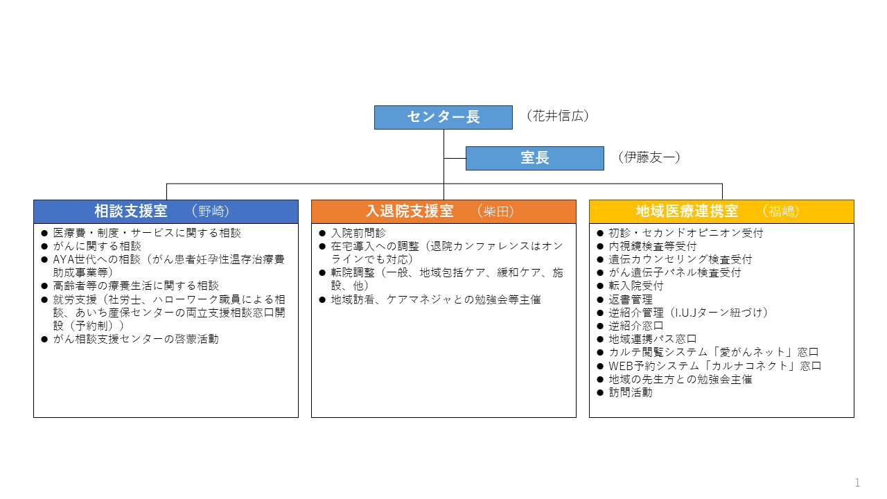 地域医療連携・相談支援センターは、患者さんに気軽に足を運んでいただけるよう、病院外来棟2階の中心部に2014年から開設されています。地域からの窓口となる地域医療連携室、入退院と地域を繋ぐ入退院支援室、がん相談支援センターの3つが機能し、地域ならびに、東海三県の包括ケアシステムと有機的に結びつき、就労関係や行政機関等との連携を図ることで、患者さんや医療機関の課題解決につながるよう、最大限の努力をしていきたいと考えております。